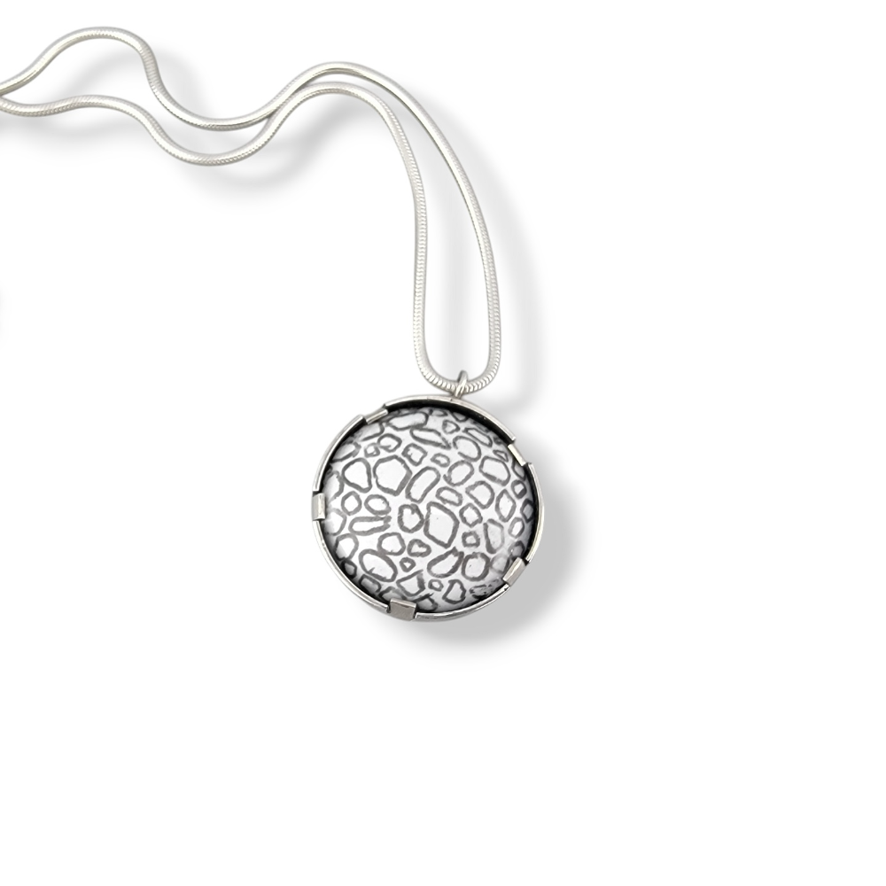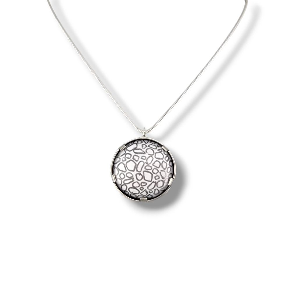 Graphite enamel pendant set in sterling silver. 16" snake chain included.