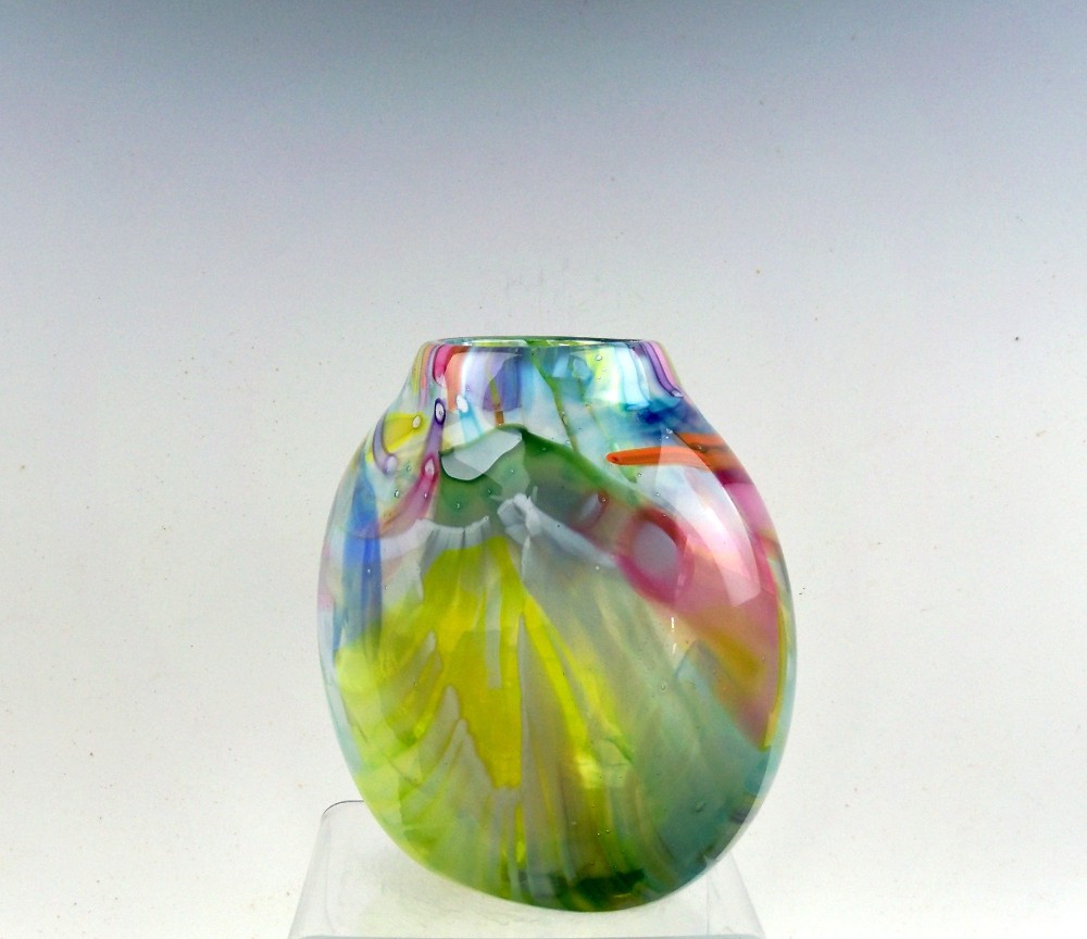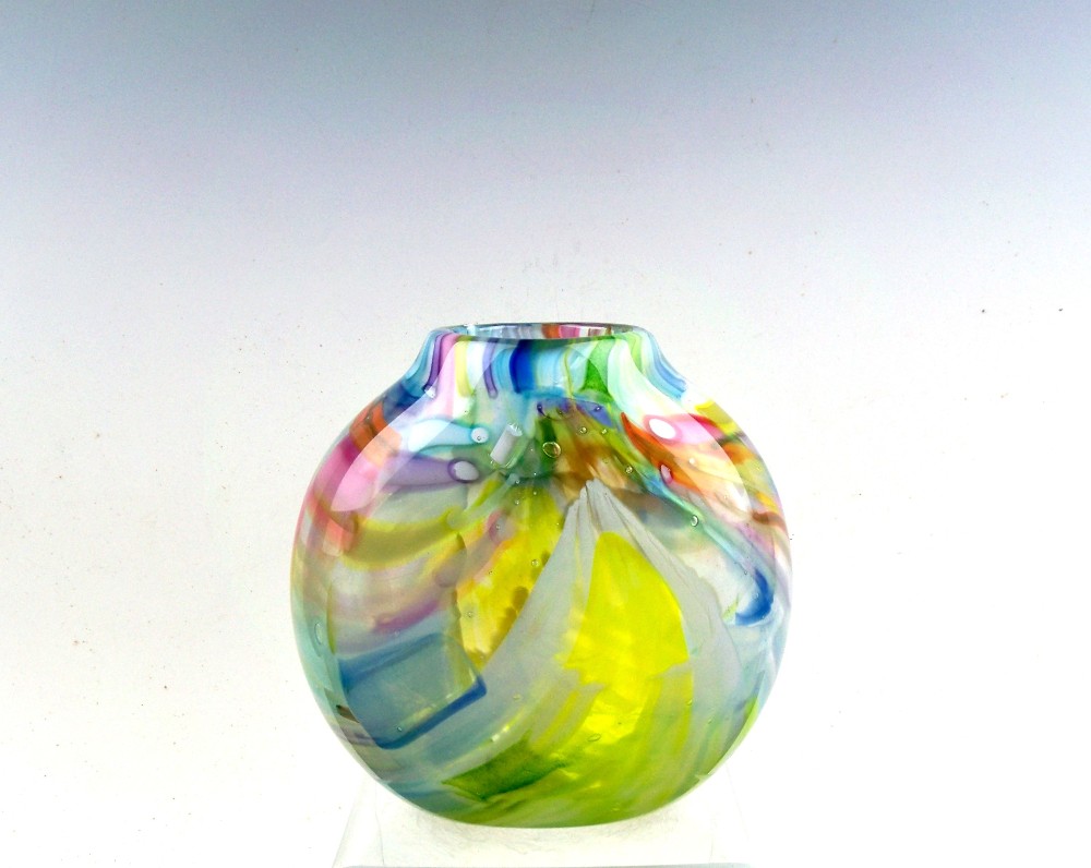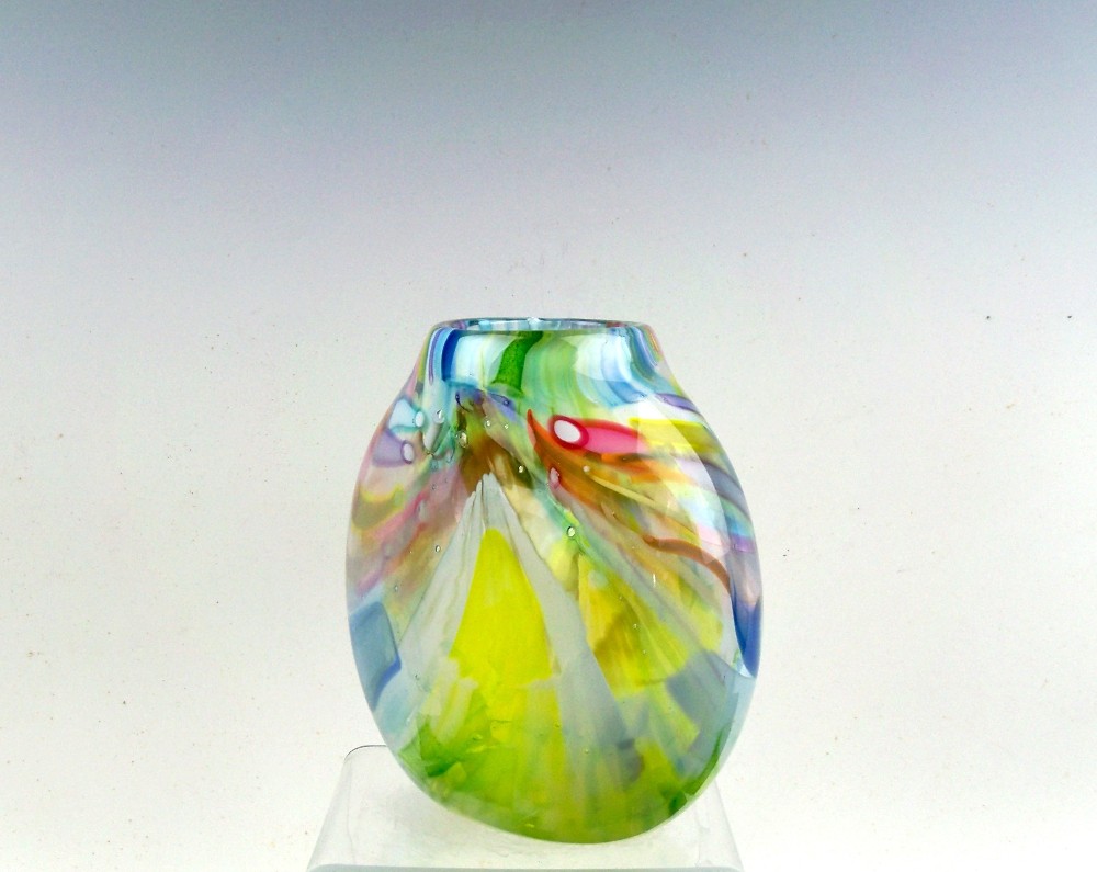 This hand blown murrini vase is made with many different colors of cane. Murrina (common pluralization murrine) is an Italian term for colored patterns or images made in a glass cane (long rods of glass) that are revealed when cut in cross-sections.