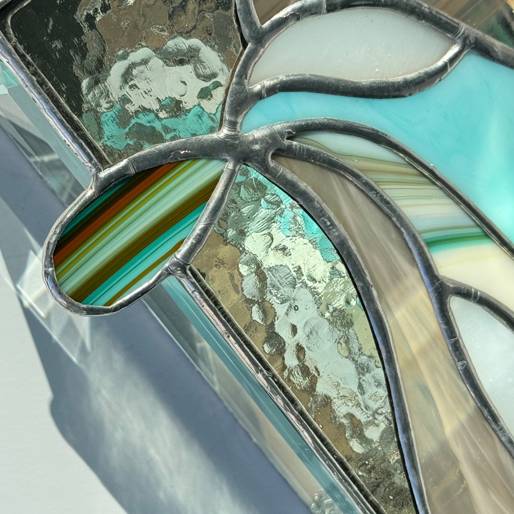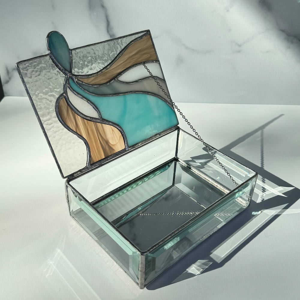 Beautiful shades of teal turquoise blended with naturall taupe brown and wispy white glass to form the lid of this elegant jewelry box.  The "background" of the flame designs is a great textured pale gray or taupe glass. An elegant and interesting accent to any room or decor.