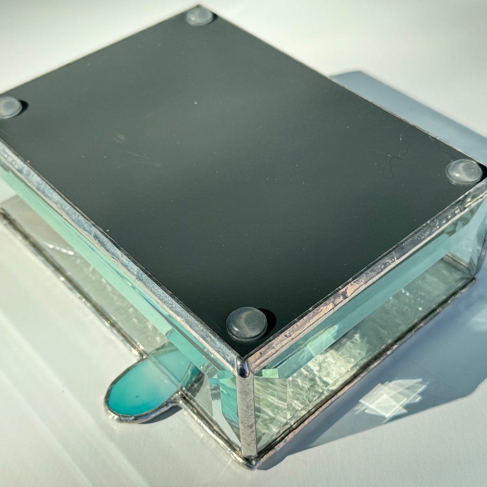 The flame design element is created with a wonderful and unusual piece of glass which incorporates all of the colors of the lid and extend beyond the base to form a handle for ease in opening the lid.    Clear bevel sides and mirror bottom allow light to reflect through the textured lid.