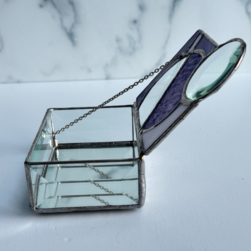 Bright shades of grape purple and a small bit of iridescent pale purple stained glass are combined, accented by a clear bevel circle piece to form the lid of this stained glass accent box.