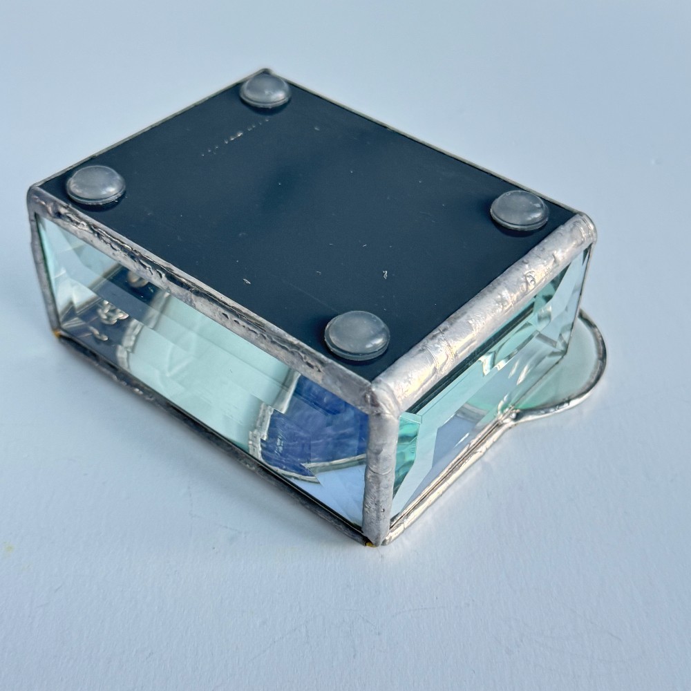 The box has clear bevel glass sides and the base is formed with mirror, reflecting light through the lid. The box measures 4" x 3" x 1.5".