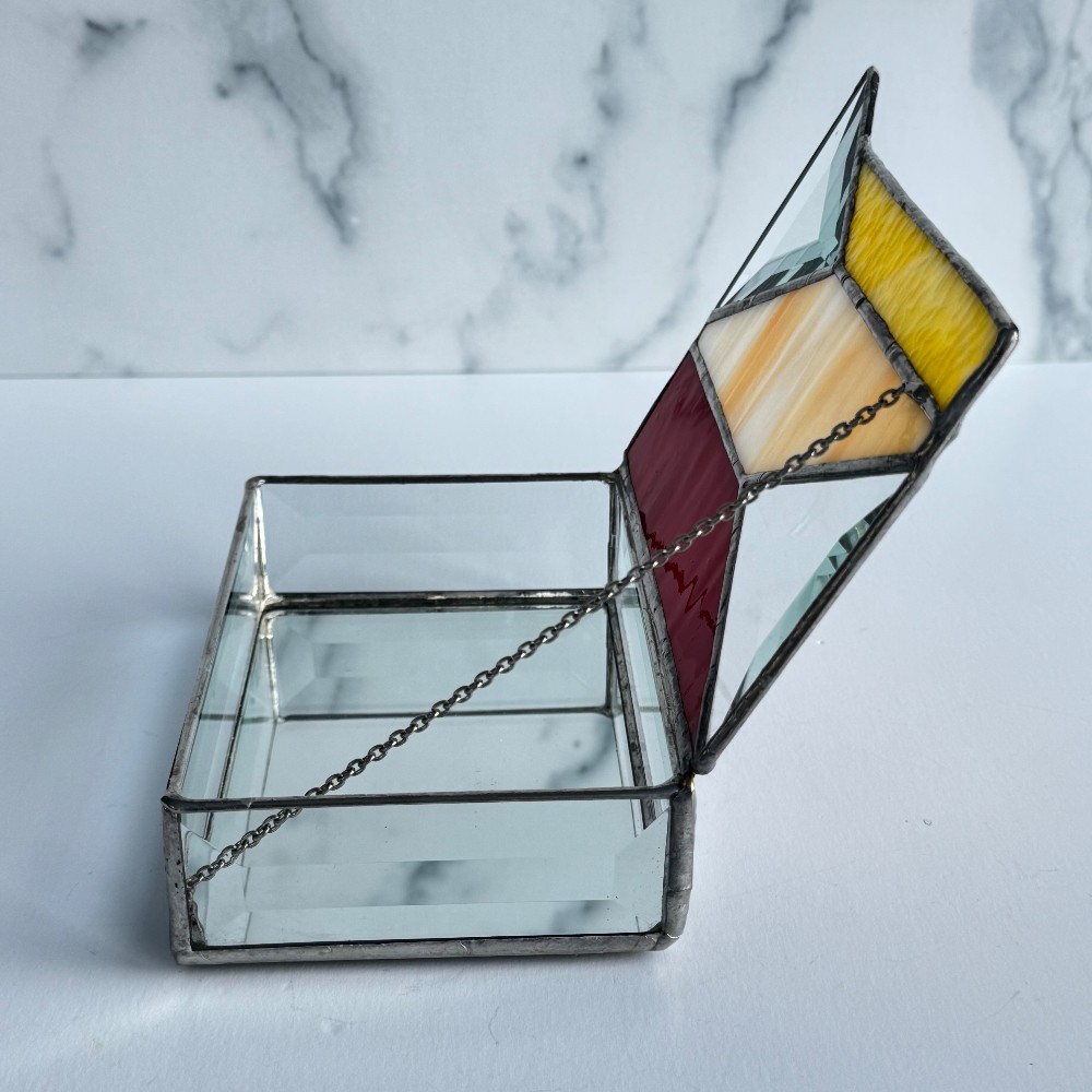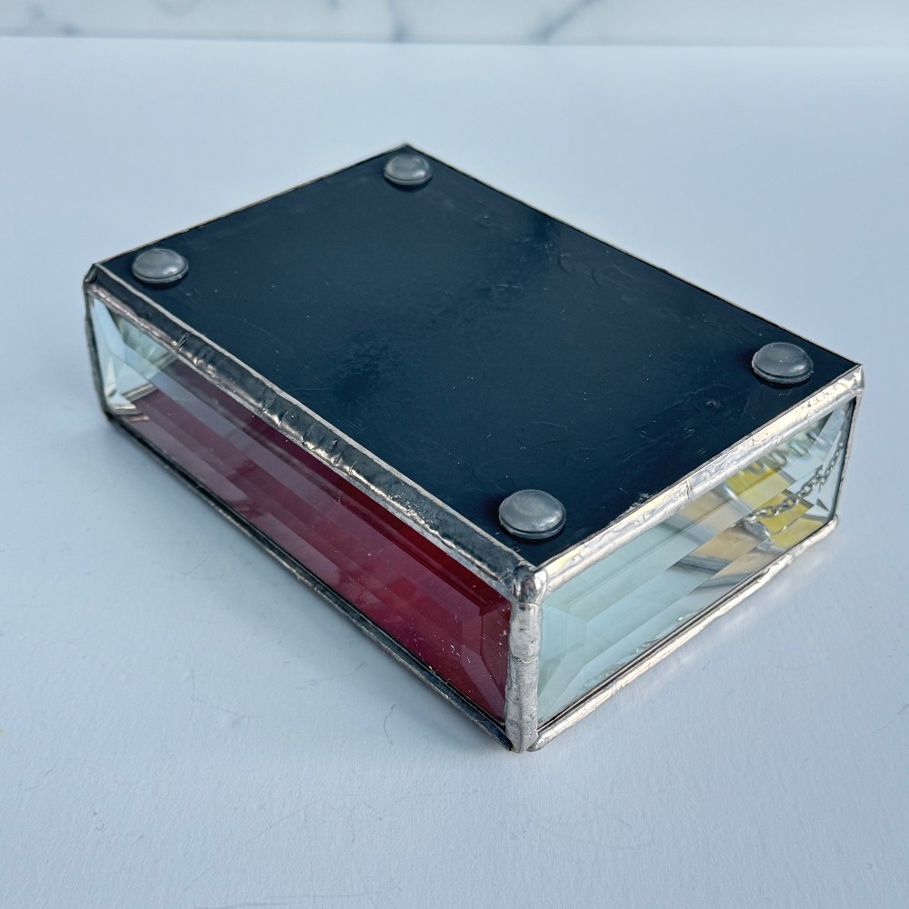 Created using the copper foil method of stained glass, this box has a hidden hinge and a chain holding the lid from flipping backwards. The solder is polished to its natural silverish finish. The edge of the lid is reinforced with an invisible strand of wire, adding strength to the lid. Rubber bump-ons are adhered to the base of the box to prevent it from sliding or scratching your furniture.